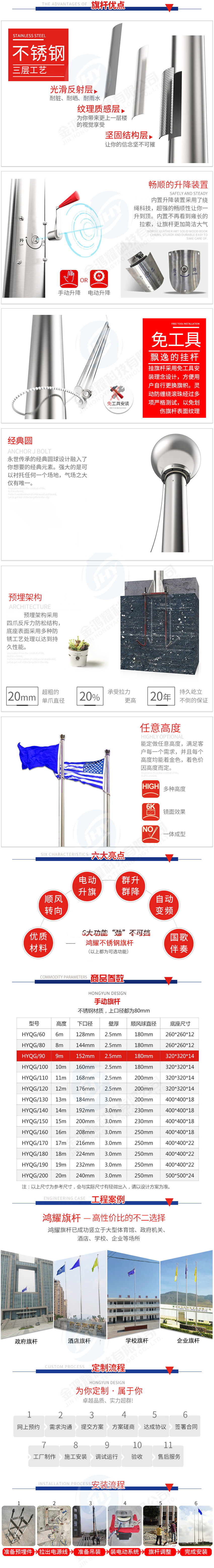 产品简介:JINHONGYAO(金鸿耀)主要销售不锈钢锥形旗杆、电动旗杆、颁奖旗及不锈钢锥形管等系列产品。...